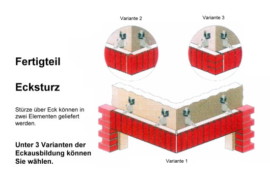 Fertigteilsturz mit Winkelaufhängung ![]() Fertigteilsturz mit Konsolabhängung ![]() Fertigteilsturz mit verbl. Massivauflagern ![]()  |